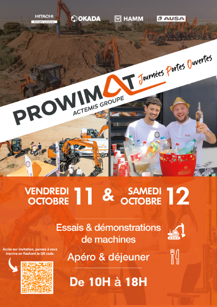 Venez découvrir nos machines Hitachi, AUSA, Okada et Hamm, profitez de démonstrations en direct et testez 6 modèles en exclusivité. Rencontrez nos équipes, partagez un moment convivial autour d’un repas et d’un apéritif. Ne manquez pas cet événement incontournable à Prowimat !